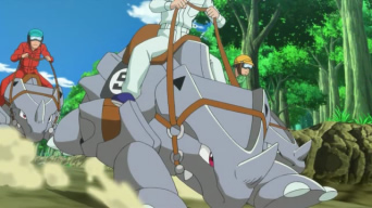 Le lendemain, Sacha est sur le départ, prêt à partir ! Le départ se passe plus ou moins bien. Mais la Team Rocket est sur le trajet, et Sepiatop jette de l’encre sur les caméras pour les neutraliser. Soudain, un filet se matérialise sur Sacha, et une cage se forme autour de Pikachu et de Rhinocorne ! La Team Rocket apparaît alors, et elle se dépêche de se sauver avec tous les Rhinocorne enfermés dans des cages…