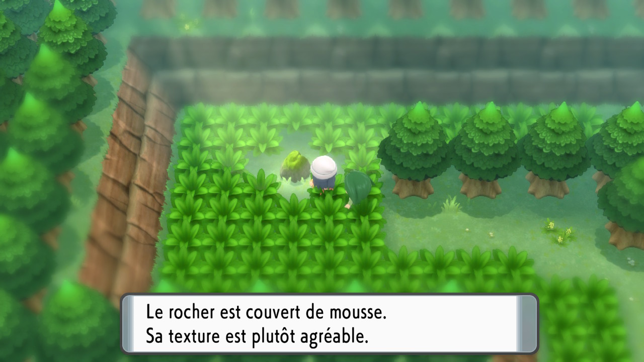 (Objets dans la forêt : à l’Ouest de l’entrée de la forêt vous trouverez un Antidote. Au nord-ouest vous trouverez un rocher “couvert de mousse”. Faites évoluer un Évoli à proximité de cette pierre pour obtenir un Phyllali. Après avoir battu les deux premiers groupes de dresseurs, récupérez un Anti-Para et une Super Ball au sud dans les hautes herbes. Au Sud-Est se trouve également une Potion et en remontant vers le nord-ouest, vous trouverez un pot de Miel dans les hautes herbes.)