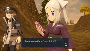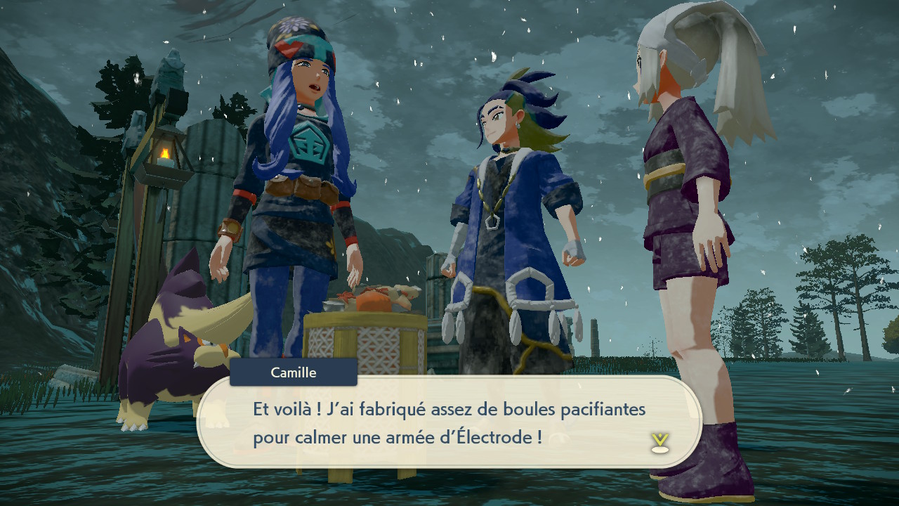 Après l’avoir battu, il invoque Farfurex. Farfurex devient alors votre nouvelle Monture Pokémon et vous offre la Plaque Toxicité. Avec lui vous allez gravir les falaises pour apaiser le Roi en haut de la montagne. Une fois devant l’Arène de la Lune, la Cour Royale d’Electrode de Hisui, affrontez à nouveau Camille en duel.