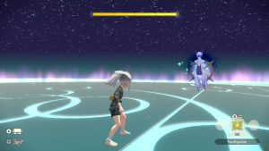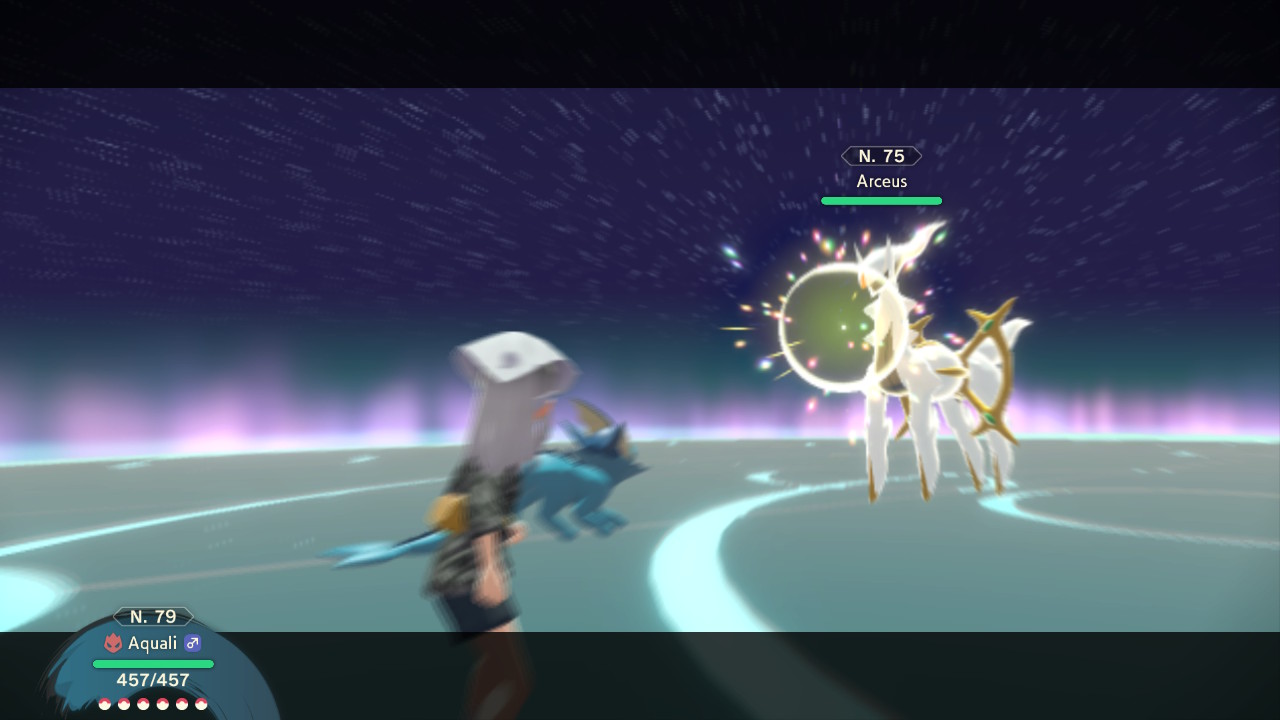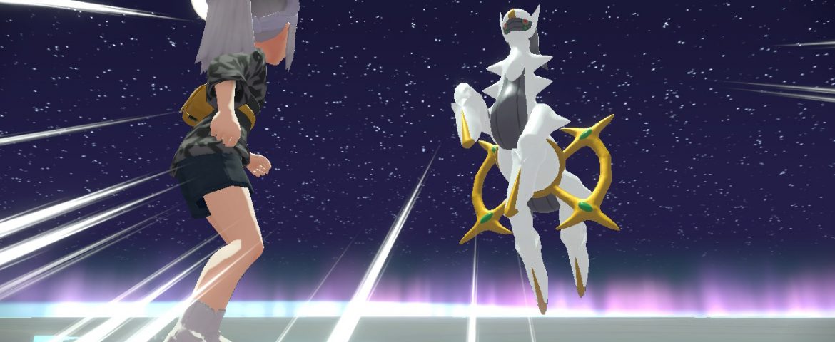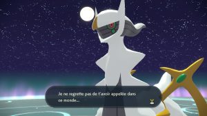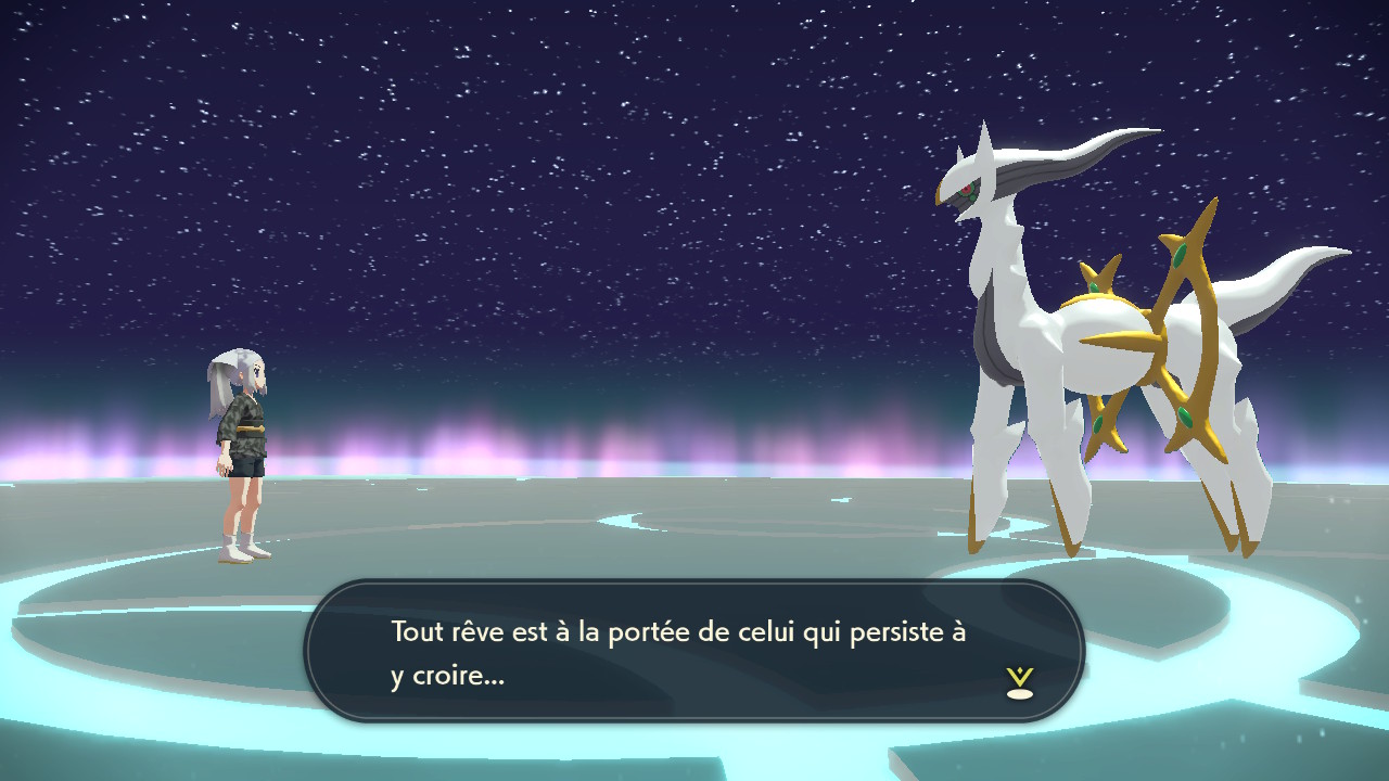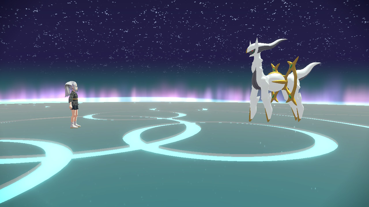 Une fois en haut du Temple de Sinnoh, la Flûte Azur émet un son. En jouant de la flûte, un escalier de lumière apparaît alors en face de vous et vous décidez de le monter. En haut, vous ferez face au Pokémon légendaire Arceus et votre Smarceus brillera et changera d’apparence, un combat commence alors avec Arceus et vous devez l’apaiser en esquivant ses attaques et en lui lançant des boules pacifiantes.