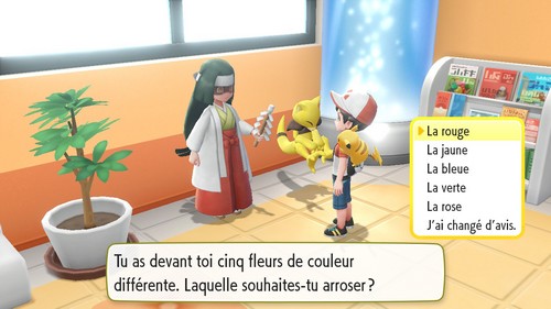 Dans ces jeux, il est impossible d’influencer les natures par reproduction puisque la Pension ne sert plus à ça. L’unique moyen de procéder est donc d’aller voir l’exorciste dans le Centre Pokémon de Céladopole. Pour 10 000 P, elle va vous poser deux questions : quelle fleur vous arroseriez, et laquelle vous tailleriez. Chaque couleur concerne une stat précise : rouge = Attaque, jaune = Défense, bleue = Attaque Spéciale, Verte = Défense Spéciale, rose = Vitesse.