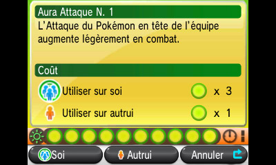 | Aura Attaque L'attaque du Pokémon en tête de l'équipe augmente en combat. |