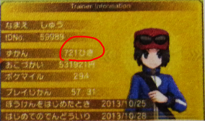 Début novembre, un guide officiel sur Pokémon X et Pokémon Y est sorti au Japon, Pokemon XY Official Guide Book Complete Story Strategy Guide. Dans ce guide, une capture d’écran de la Carte Dresseur a été publiée. Cette carte présente une couleur dorée, mais elle indique surtout que le dresseur détient 721 Pokémon. Or jusqu’ici, 718 Pokémon seulement étaient reconnus officiellement – Zygarde étant le Pokémon numéro 718.