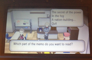 Actuellement si vous vous rendez aux Editions d’Illumis, vous découvrirez que la Rédactrice-en-Chef est absente et est sur la piste d’un Pokémon fabuleux dans la montagne. Une fois l’évènement de Volcanion activé, elle sera de retour dans son bureau et vous pourrez accéder allègrement à son mémo sur le Pokémon légendaire :