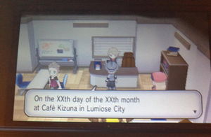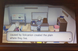 • « un créateur de nation : durant le XXème jour du XXème mois au café « Les Partenaires d’Illumis ». Dans la pointe la plus au sud de la région de Kalos, il semble y avoir un culte sur Volcanion comme un Pokémon créateur de la nation. Les gens semblent croire qu’une explosion de vapeur causée par Volcanion a crée la plaine où ils vivent. A vrai dire, dans le passé, une énorme chaine de montagne a soudainement disparu dans cette partie de la région suite à une explosion inexpliquée… »