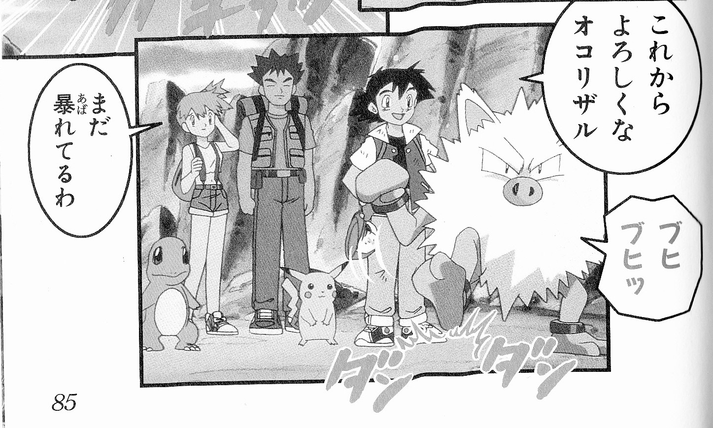 Le trio initial dans l’un des épisodes cultes de la saison 1 (image issue du vol. 7 du Pocket Monsters Film Comic, p. 85)