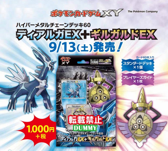 En parallèle et comme d’habitude, un deck à thème sortira le même jour au Japon, intitulé Deck Dialga-EX + Exagide-EX Hyper Chaine Métallique. Celui-ci tournera autour du type acier et contiendra quatre cartes holographique, pour un prix de 1000 Yens (soit 7,20 Euros). A l’international, les deux produits seront combinés pour former une nouvelle extension, sans doute aux alentours du mois de novembre.Cette nouvelle annonce éclaircit d’ailleurs un autre mystère. Souvenez-vous, à la mi-février, Pokémon-France vous avait annoncé qu’une nouvelle licence avait été déposée, du nom de… Phantom Gate (lire Encore une marque déposée pour Pokémon ?). Finalement, il semblerait qu’il ne s’agisse « que » de cette nouvelle extension.