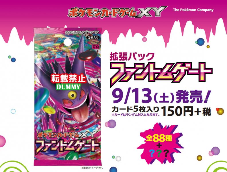 Prévu pour le 13 septembre au Japon, cette quatrième extension du Bloc XY devrait compter au moins 88 cartes. Elle tournera autour de deux Pokémon, Ectoplasma et Méga-Ectoplasma, dont l’attaque principale se nommera justement Phantom Gate.