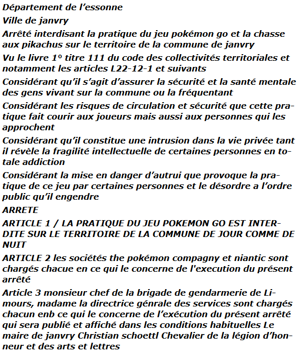 Plus sévère encore, cet arrêté vise cette fois les joueurs et leur interdit complètement de jouer à Pokémon GO sur le territoire de Janvry, là où Bressolles demandait à Niantic de retirer les éléments du jeu implantés dans la ville. Interviewé par la presse locale, le Maire va également plus loin avec des arguments extrêmement clichés : « Quand je vois des enfants à deux heures du matin courir dans les rues au risque de se faire renverser, et des adultes pénétrer dans des propriété privées, je me dis que quelque chose ne va pas. »